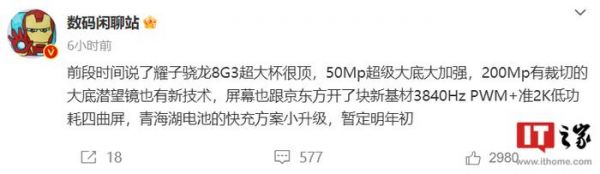 据博主 @数码闲聊站 今日爆料,荣耀骁龙 8 Gen 3“超大杯”新机预计搭载 5000 万像素超级大底主摄,较上代“大加强”,配备 2 亿像素大底潜望镜(有裁切)并加持新技术。此外,该手机将配备京东方新基材准 2K 低功耗四曲屏,支持 3840Hz PWM 高频调光,快充方案小升级,暂定明年初发布。