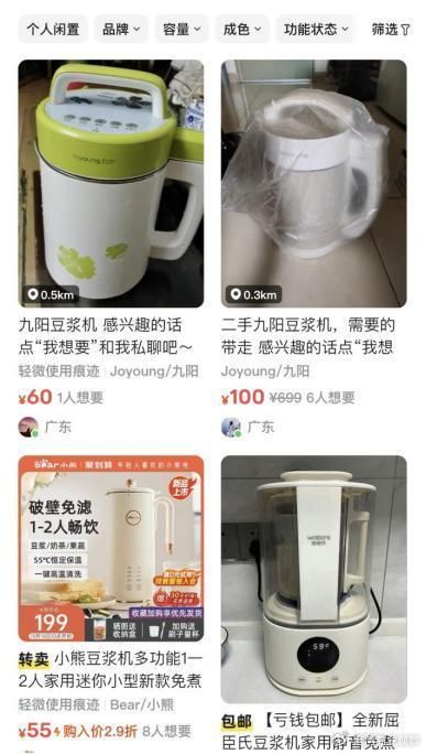 在小家电领域中,豆浆机也是常被闲置的品类。浏览二手交易平台闲鱼、转转不难发现,众多消费者发帖表示自家购买的豆浆机使用一两次之后就闲置积灰。而一般情况下,出售的二手小家电价格通常为售价的半价或者更低。