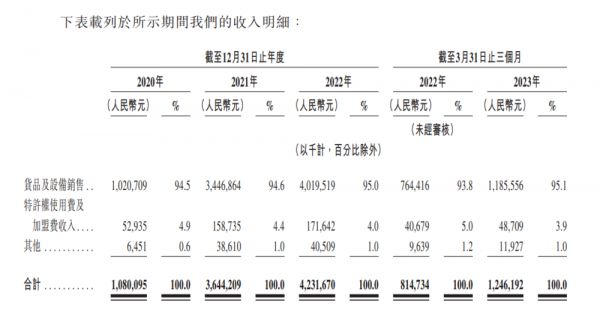 和蜜雪冰城一样,茶百道的收入也主要来源于向加盟商销售原材料和设备。据招股书,2022年其货品及设备销售收入为40.2亿元,营收占比为95%。从2020年到2023年前三个月,其该项收入占比均超过93%。需要指出,蜜雪冰城的核心原材料均为自主生产,茶百道远非“供应链公司”。