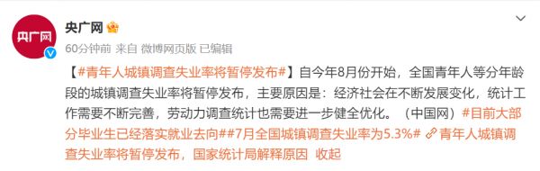 昨天(8月15日),国家统计局宣布,将暂停发布全国青年人城镇调查失业率。一时间,舆情为之一震,好久没看见社交媒体这么热闹了。