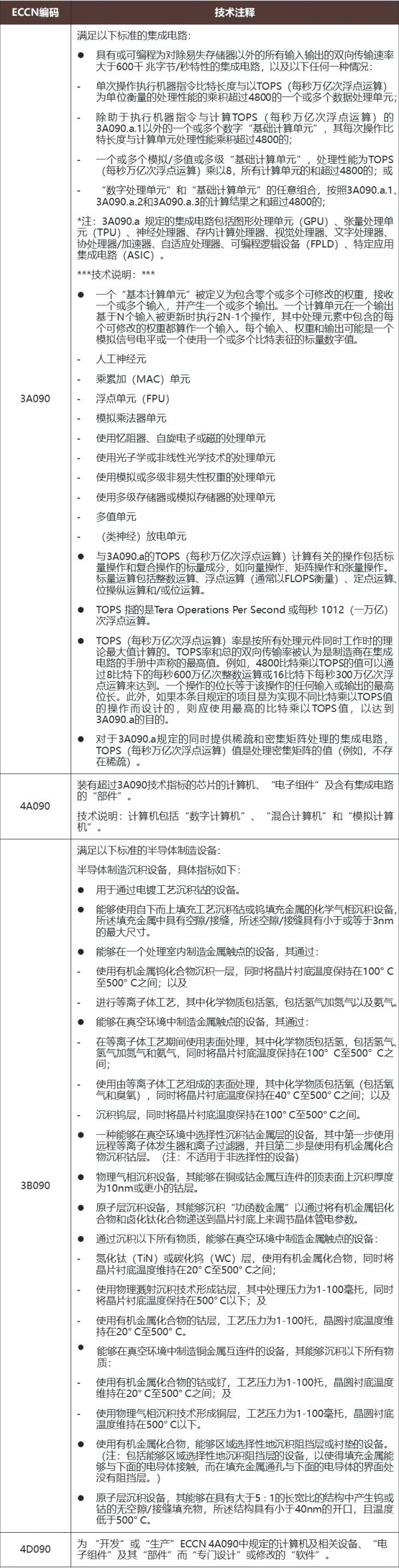 编注:2022年10月7日,美国商务部发布半导体新规,新增出口管制分类编码ECCN 3A090、4A090、3A090、3B090、4D090,涉及先进集成电路及其产品,制造设备以及开发软件。