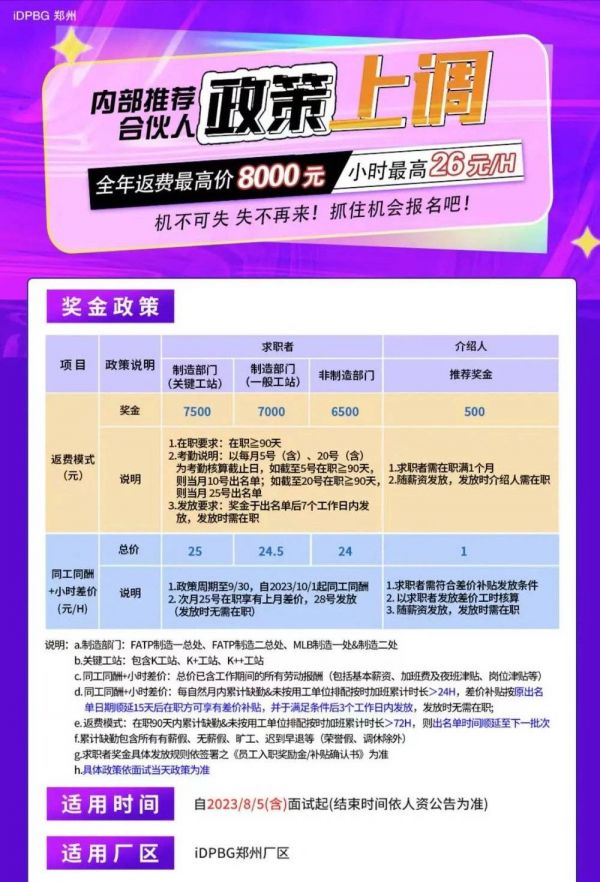 8月15日,“郑州富工联招聘”微信公众号发布招募信息,高价延期,郑州富士康26元/小时,或者返费8000元招聘(返费条件包括一定在职时长/打卡天数)继续。招聘海报显示,8月4日,企业官方公布告知市场:今年市场最高价已敲定,并且消息很快传播河南市场。