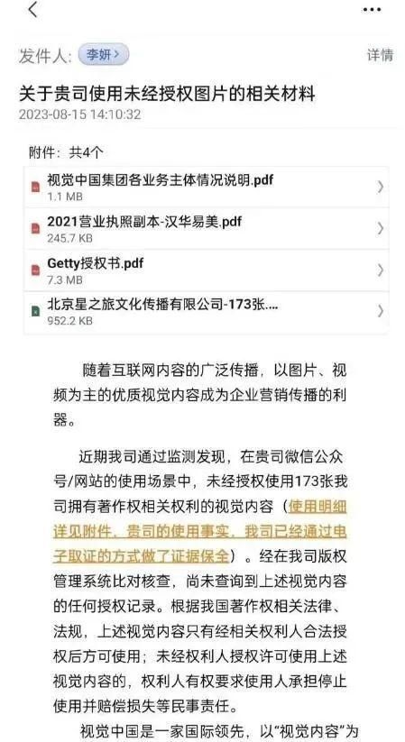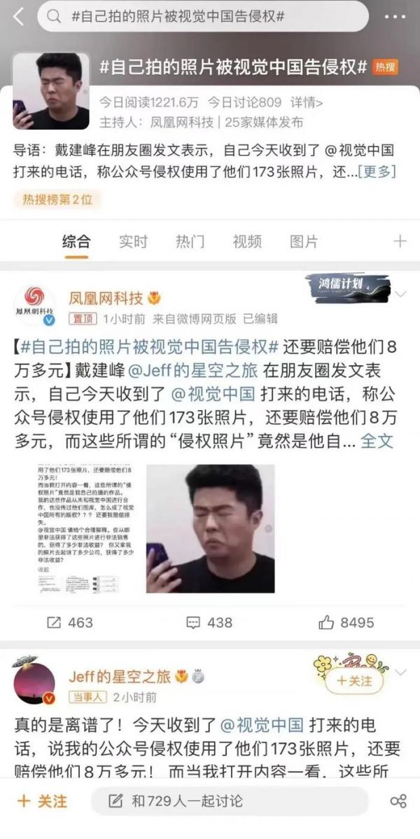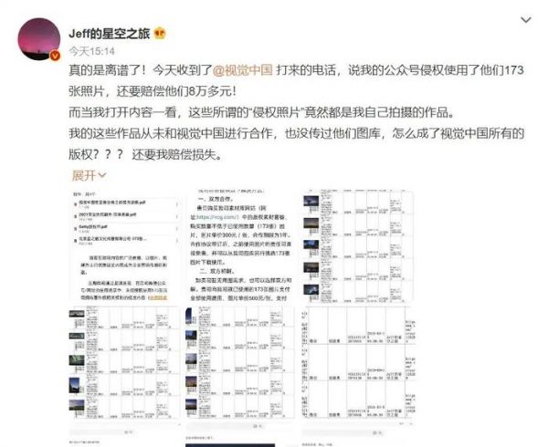 8月15日,微博名为“Jeff的星空之旅”的用户发文称,接到视觉中国方面电话、邮件,对方称公众号《Jeff的星空之旅》侵权使用视觉中国173张照片,要求赔偿8万多元。