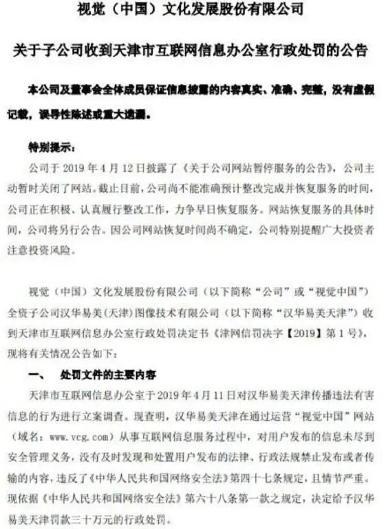 当年4 月 18 日,对视觉中国的处罚决定出炉,天津市网信办对网站运营主体汉华易美(天津)图像技术有限公司(下称汉华易美)作出从重罚款的处罚。当天盘后,视觉中国发布公告称行政处罚金额为30万元。至此,此事才算平息。