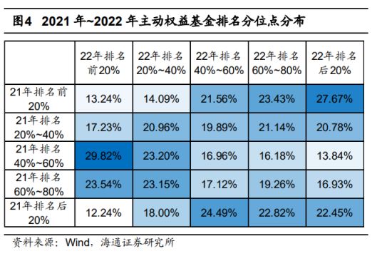 下面的图是2021年业绩排名五个20%档的基金,假设你在2022年初去买基金,大概率会买到第一排(业绩排名前20%),但它们中有28%的概率变成业绩最差的一档,只有13%的概率还留在最好的一档。