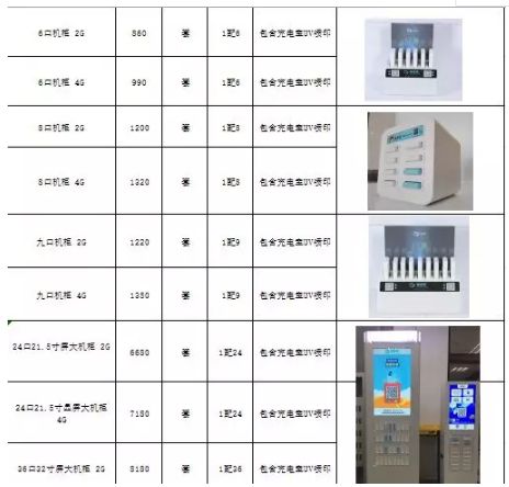 而机柜的价格则根据接口的数量相应上涨。比如:5口为300元、6口2G为860元、8口2G为1200元、9口2G为1220元、24口2G为6680元、36口2G为8180元(以上价格均包含接口同等数量的充电宝)。