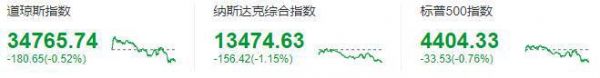 道琼斯指数收于34765.74点,下跌180.65点,跌幅0.52%;标准普尔500指数收于4404.33点,跌幅0.76%;纳斯达克指数收于13474.63点,跌幅1.15%。