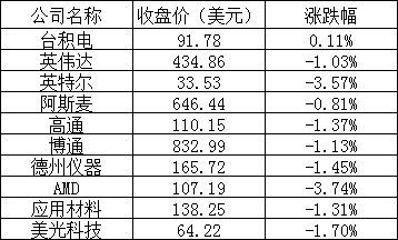 芯片龙头股普遍下跌,英特尔和AMD跌幅超过3%,英伟达、高通和博通等跌幅超过1%;台积电逆势上涨,涨幅不到1%。