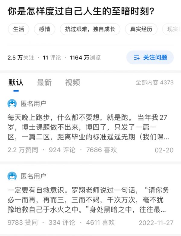 在知乎有关人生“至暗时刻”的讨论中,对病痛、生死离别、人生转折等大课题的讨论仍然是主要基调。网友们相互激励着走出泥潭,书写一场集体救赎与自救。