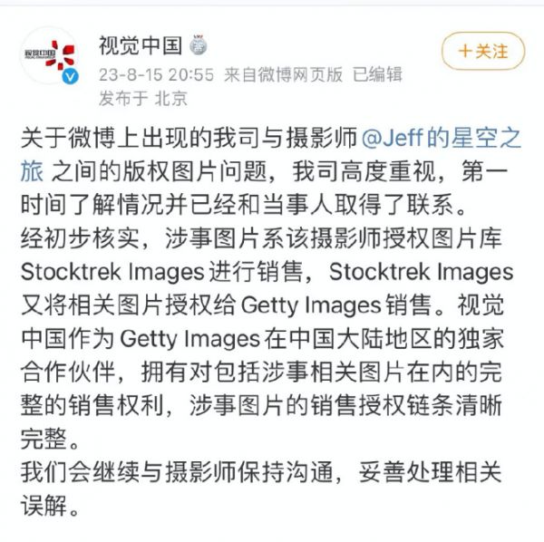 针对视觉中国的声明,戴建峰8月16日早上回应,表示自己已经跟Stocktrek Images核实:“Stocktrek明确告知我,视觉中国无权销售我的作品,也没有我作品的任何版权。Getty也无权将我的作品再次转售。”