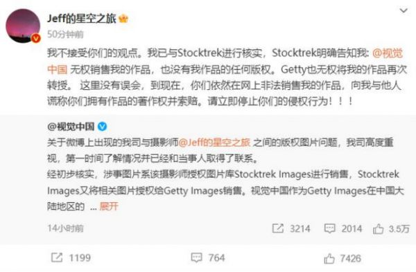 戴建峰回应,称视觉中国无权销售其作品。(图/微博@Jeff的星空之旅)
