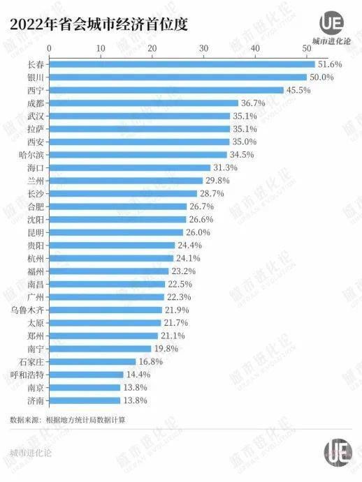 数据显示,全国高经济首位度的省份多半位于中西部地区——2022年共有14个省会城市GDP占全省比重超过25%,9个省会城市占比超过30%,其中7个位于中西部地区。