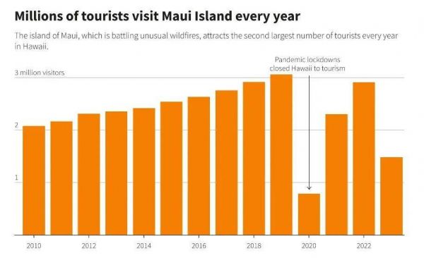 毛伊岛的拉海纳是夏威夷的重要旅游目的地。新冠疫情后,毛伊岛引领了夏威夷群岛的旅游业反弹。夏威夷商业经济发展和旅游部的统计数据显示,今年上半年,该岛吸引了超过148万名游客,占夏威夷游客总数的30%;同期,该岛创造了35亿美元的游客支出,占夏威夷游客总支出的32.3%。