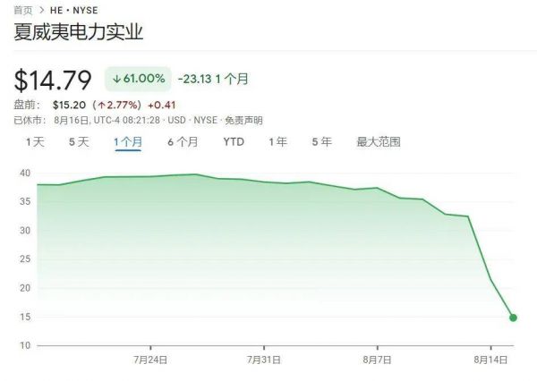 据报道,已有受害者对夏威夷电力公司提起诉讼,指控该公司存在疏忽,没有采取切断电力的措施来降低火灾风险。这也导致该公司上周一天内市值蒸发超过10亿美元,股价暴跌三分之一。截至8月15日收盘,该公司股价已跌至14.79美元/股,较8月7日的收盘价已累计下跌60%。
