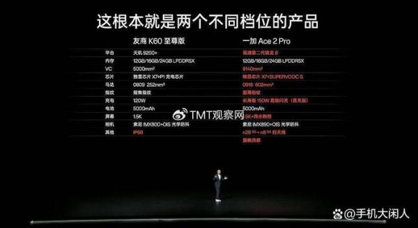 果然今天的一加Ace 2 Pro的发布会上,一加也不客气的直接上了对比图,然后先是喊话雷军,表示那天雷军演讲对比不公平,然后直接上一加Ace2 Pro对比Redmi K60至尊版,这种对比自然是扬长避短,一加这边处理器VC马达拍照充电等都自认为比对手Redmi K60至尊版强,表示不是一个档位的产品。