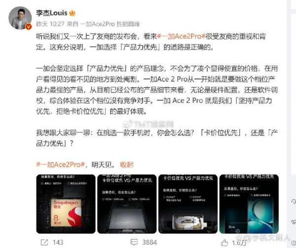 昨天李杰这么一番话出来,然后一加Ace 2 Pro刚好隔两天发布,那是直接扛上了,江湖又有好戏。