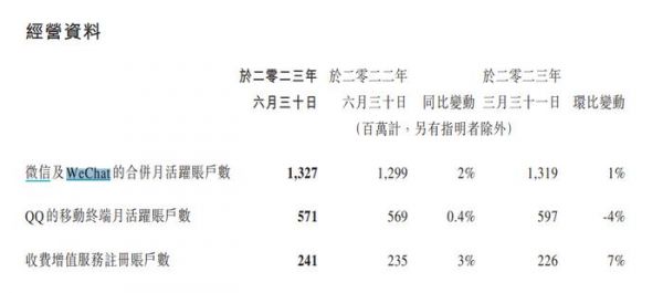 用户方面,微信在高基数的基础上仍然保持增长,截至2023年6月30日,微信及WeChat的合并月活跃账户数为13.27亿,同比增长2%,环比增长1%。QQ的移动端月活为5.71亿,同比增长0.4%,环比降低4%。