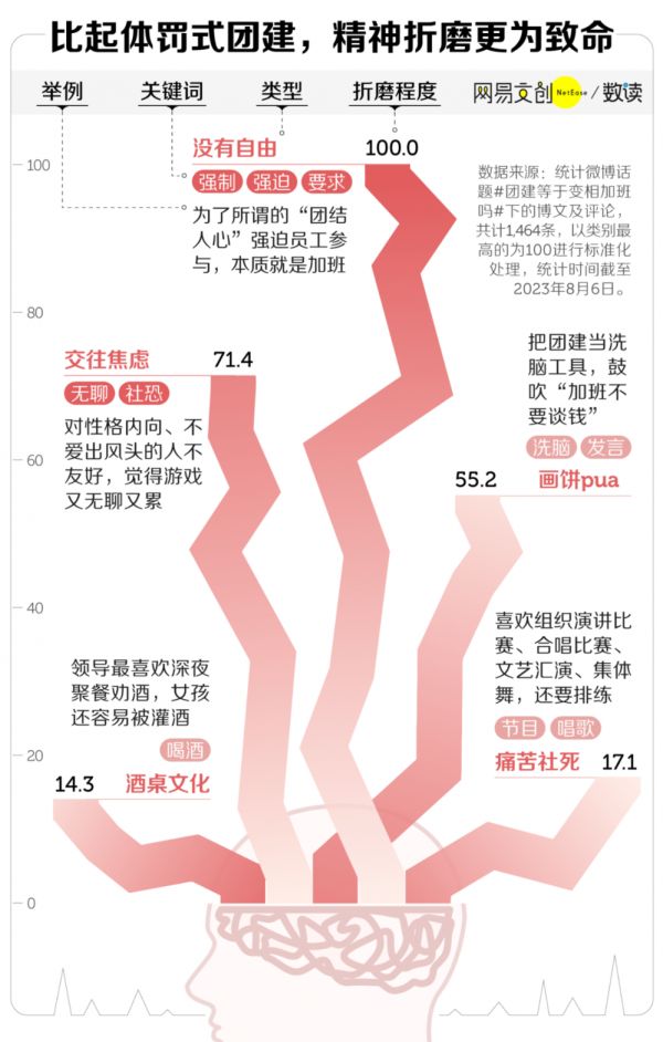 我们统计了微博话题 #年轻人为什么如此反感团建# 下的 1506 条博文和评论,发现大家的吐槽点都大同小异。