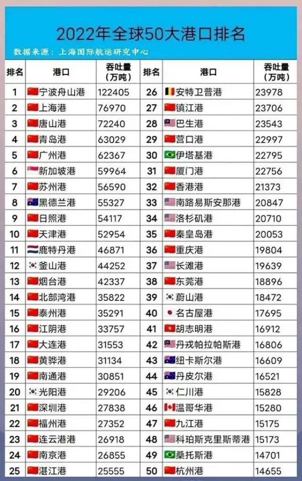 中国是“世界工厂”,也是全球货物贸易第一大国。每年都要进出口大量的货物,其中蕴含着庞大的跨境货运需求。2022年全球港口吞吐量排名中,前十大港口,中国独占8席。