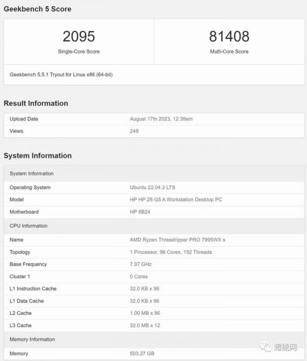 在Geekbench 5测试中,Ryzen Threadripper PRO 7995WX的单线程得分为2095,多线程得分81408,多线程得分比现有世界记录高出不少,当前Geekbench 5多线程记录是由Xeon w9 3495X用液氮超频跑出来的,得分为72786,现在而HP这台工作站应该是在没超频的情况下跑出来的分数。