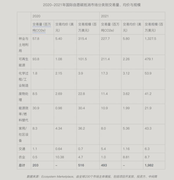 尽管如此,在全球范围内,碳抵消项目,特别是林业碳汇依然广受欢迎,毕竟比起砍掉高排放的业务,购买碳信用额度只需要花钱,省时省力。根据Ecosystem Marketplace统计,在自愿碳抵消市场总量扩大的背景下,林业与土地利用碳抵消的市场份额占2021年自愿碳抵消交易总量的46%,在各类碳抵消中已经呈现出领先地位。