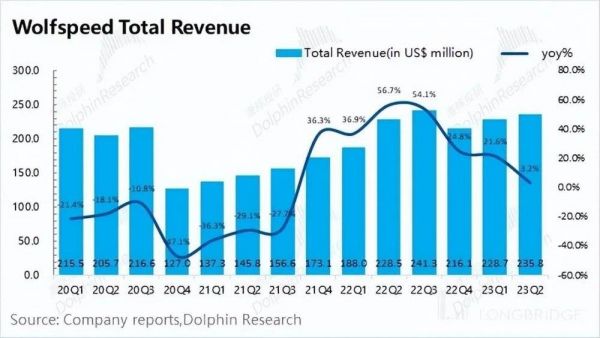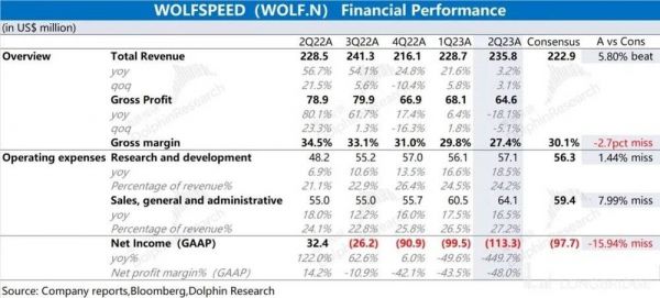 Wolfspeed 在 2023 财年第四季度(即 23Q2)实现营收 2.36 亿美元,同比增 3.2%,小超市场预期(2.23 亿美元)。