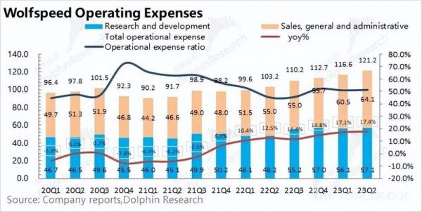 2. 经营费用:Wolfspeed 在 2023 财年第四季度的经营费用达到 1.21 亿美元,同比增长 17.4%,费用刚性增长。销售、一般和管理费用及研发费用均有不同程度的提升,其中研发费用持续保持 20% 以上。