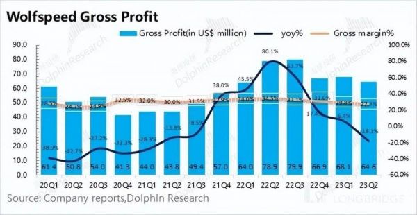 Wolfspeed 在 2023 财年第四季度(即 23Q2)实现毛利润 0.65 亿美元,同比下滑 18.1%。收入好歹还在增长,而毛利这边已经开始“撑不住”了。