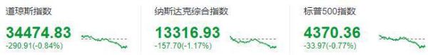 道琼斯指数收于34474.83点,下跌290.91点,跌幅0.84%;标准普尔500指数收于4370.36点,跌幅0.77%;纳斯达克指数收于13316.93点,跌幅1.17%。