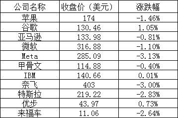 大型科技股普遍下跌,Meta跌幅超过3%,苹果和微软跌幅超过1%;谷歌逆势上涨,涨幅超过1%。