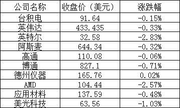 芯片龙头股普遍下跌,英特尔和AMD跌幅超过2%,美光跌幅超过1%。