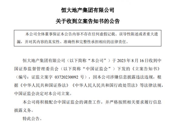 此前16日,恒大地产因涉嫌信息披露违法违规,被中国证监会立案调查。