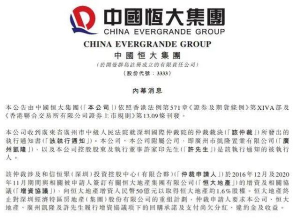 公告称,收到广州市中级人民法院就深圳国际仲裁院2022年12月21日的仲裁裁决所发出的执行通知书。中国恒大、中国恒大附属公司广州凯隆、以及中国恒大控股股东、执行董事许家印为该执行通知的被执行人。