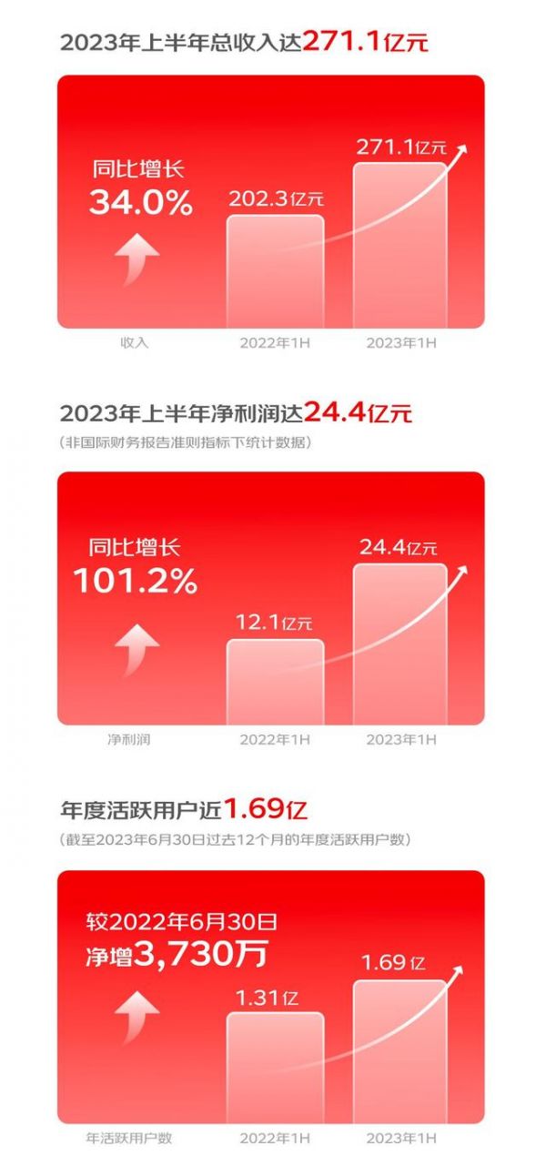 8月16日,京东健康股份有限公司发布2023年中期业绩公告。报告期内,京东健康总收入为人民币271亿元,同比增长34%,非国际财务报告准则指标下(Non-IFRS)净利润24.4亿元,同比增长101.2%;截至2023年6月30日,过去12个月的年度活跃用户数量近1.69亿,相比于截至2022年6月30日的年度活跃用户数净增加3730万。京东健康互联网医院日均在线咨询量超过44万。