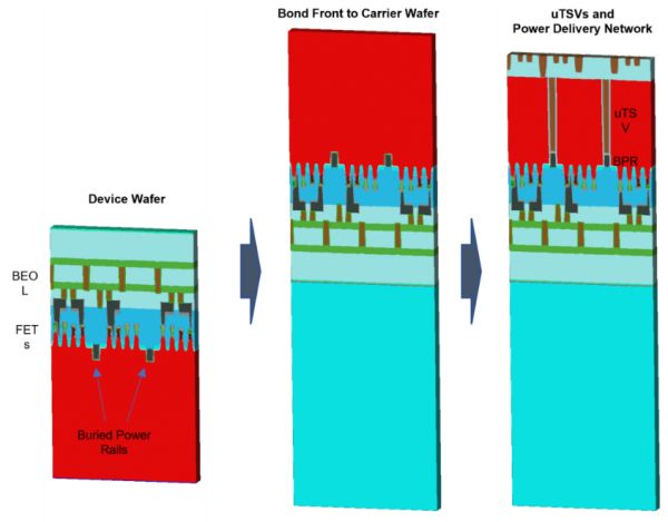 真正的背面供电网络的实现伴随着额外的技术复杂性。一方面,背面供电技术需要一种专用的晶圆减薄工艺,以及处理将器件晶圆背面电连接到正面的纳米硅通孔(nTSV)的能力。