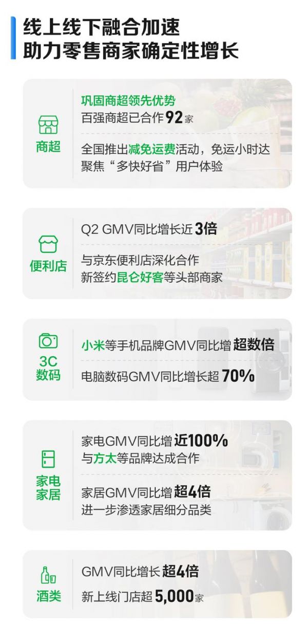 二季度财报数据显示出供给丰富的效果,京东到家新上线酒类门店数超过5000家,GMV同比增长超过4倍;3C数码领域继续保持快速增长,小米等安卓手机品牌二季度实现GMV同比数倍的高速增长;电脑数码品类的GMV则同比增长超过70%。