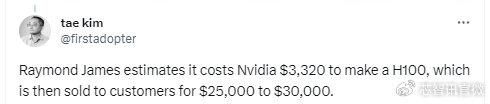 Tae Kim援引的是金融咨询公司Raymond James数据,H100 GPU的成本为3320 美元。目前尚不清楚成本分析有多深入,可能这是一个纯粹的制造成本问题(在考虑良率的情况下平均每片晶圆和其他组件的价格),那么Nvidia 仍然需要支付大量的费用利润。