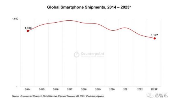 8月18日消息,根据市场研究机构Counterpoint于8月17日发布的最新的全球手机出货量预测报告显示,2023年全球智能手机出货量将同比下滑6%至11.5亿部,创十年来最低纪录,主要受中国和美国这两大主力市场销量不振所拖累。