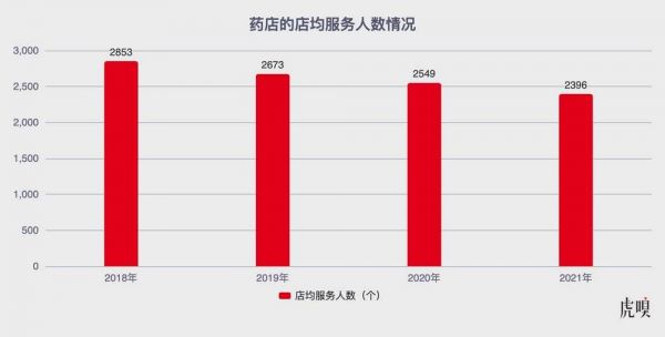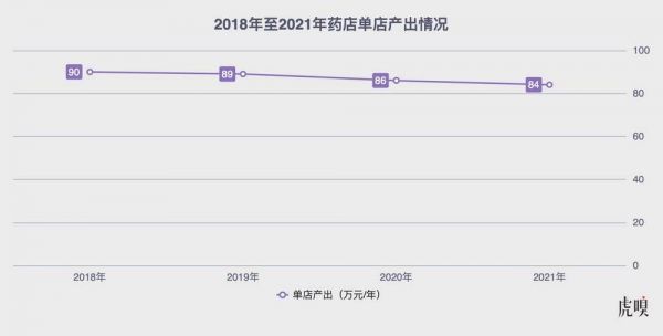 连锁药店规模急速扩张之下,单店收益却在下降。根据中康CMH数据,2021年单店产出降到了84万元/年相比2018年下降了2.3%,每家门店的服务人数也下降了5.7%。