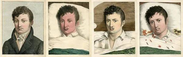 图2.19世纪绘出的黄热病的四个临床阶段。图片来源:Etienne Pariset and André Mazet. 1820. Four illustrations showing the progression of yellow fever.