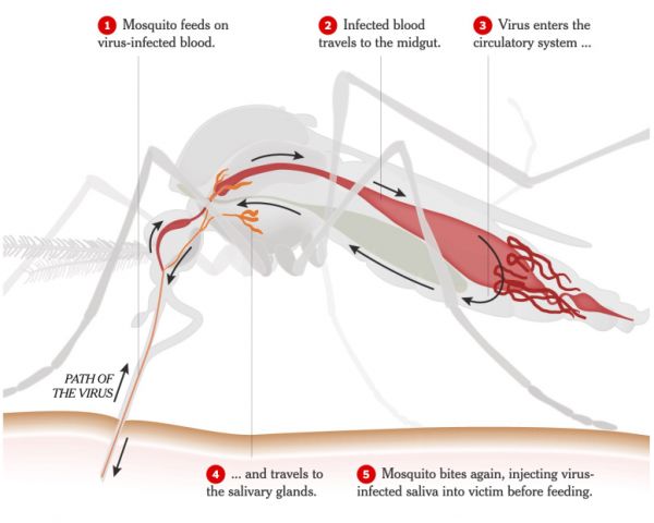 图3. 蚊子感染并传播病毒的过程。图片来源:Snodgrass, Robert Evans. 1959. "The anatomical life of the mosquito." Smithsonian Miscellaneous Collections, 139, (8), 1–87.