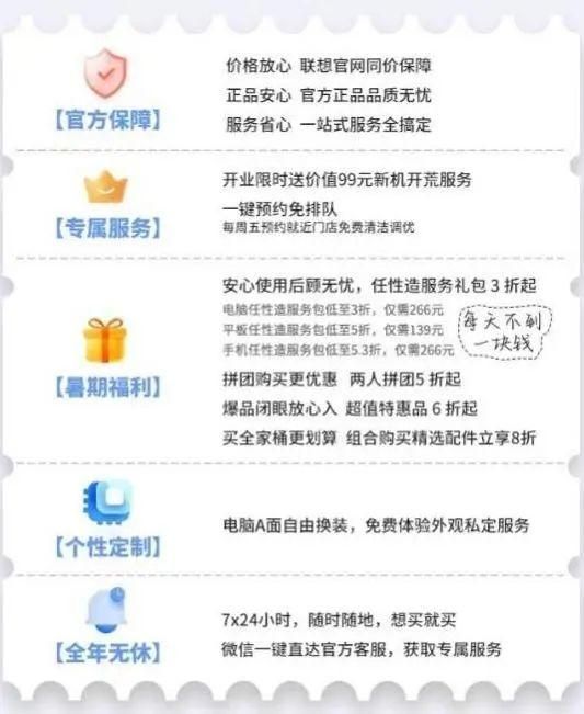 官方保障层面,官方旗舰店与官网实现同价保障、正品品质鉴定以及一站式服务组合拳,保证省心省力的消费体验;专属服务层面,开业限时赠送价值99元的新机开荒服务;而在暑期福利层面,联想更是提供了两人拼团五折起等多重优惠;个性定制则为用户提供免费外观私人定制服务,打造专属个性电脑;全年无休则意味着,联想官方旗舰店购买通道7*24小时全面敞开,消费者可以随时随地,一键直达官方客服。