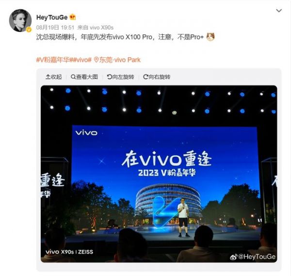 IT之家 8 月 20 日消息,据微博网友透露,vivo 在昨天的 2023 年 V 粉嘉年华上官宣 vivo X100 系列年底发布,@数码闲聊站 进一步爆料称,年底之前(11 月)发布最新最强的影像旗舰 X100 Pro,X100 Pro+明年发布。