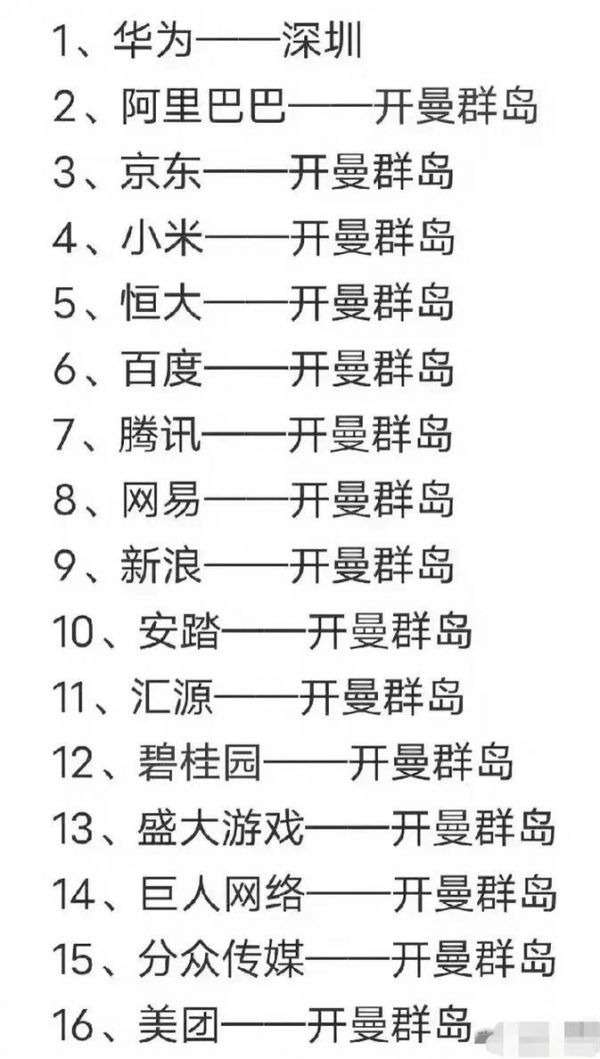另外京东,网易,新浪,安踏,汇源,碧桂园,盛大游戏,巨人网络,分众传媒等等。天啊,这是都是大家耳熟能详的知名大公司呀!全都清一色注册地开曼群岛。