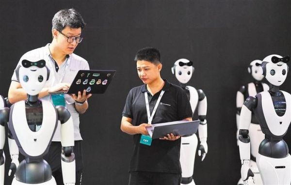 8月16日,工作人员在对人形机器人进行数据调试。本届机器人大会,各类人形机器人凭借酷炫的外观、丰富的应用成为会场内外关注的焦点。