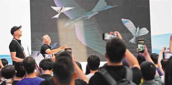 8月17日,工作人员展示仿生雨燕。这款产品重量仅有42克,翅膀由许多轻薄的扇片组合而成。