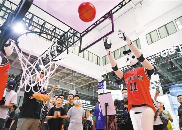 8月17日,机器人在展示投篮技术。未来在AI技术驱动下,人形机器人将拥有更强的感知、认知、决策和执行能力,从而在服务、教育、制造等领域获得更大的应用空间。