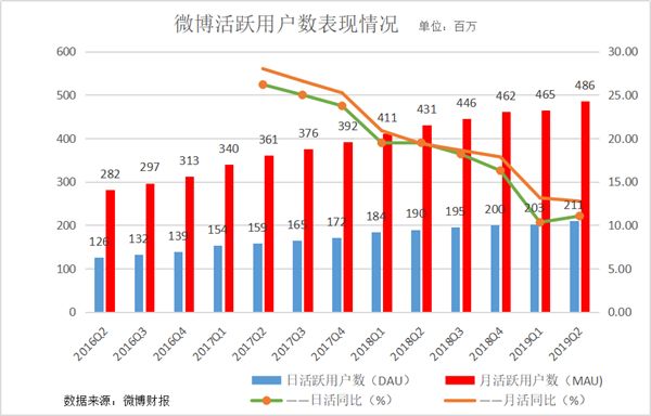 微博2019年6月的月活跃用户数(MAUs)为4.86亿,较上年同期净增约5500万。月活跃用户数中94%为移动端用户。 2019年6月平均日活跃用户数(DAUs)为2.11亿,较上年同期净增约2100万。