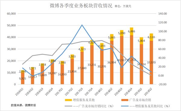 2019年第二季度微博增值服务营收为6120万美元,较上年同期的5660万美元增长8%,而上个季度的同比增速为23.67%。微博解释成,同比增长主要得益于2018年第四季度收购的直播业务产生的营收,该增长被游戏营收的下滑部分抵消。