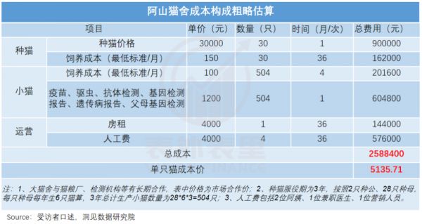 他大致估算一下,穷尽一只种猫的生育能力,按每只小猫2个月出窝算,养殖场一只猫的成本可能不到50块。